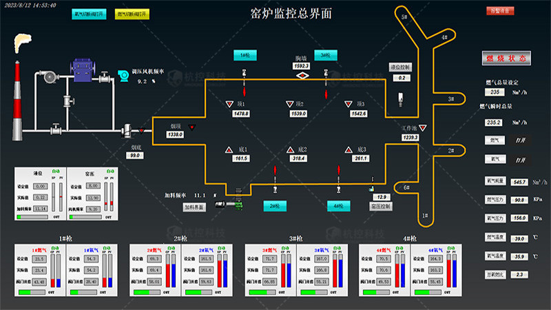 根據工藝過程的特性及控制要求,我公司推出的DCS控制系統,主要控制內容包括熔化池及工作池的溫度、氧氣流量、天然氣流量、玻璃液位、窯爐壓力的自動調節、連續加料的自動控制以及通道溫度的自動調節、燃燒系統流量的自動控制等。我司在燃燒領域的控制技術越來越完善,使得整個項目的運作開發、現場調試安裝和投運后的維護都變得相對簡單,充分體現了分敬控制、集中管理的工作模式。